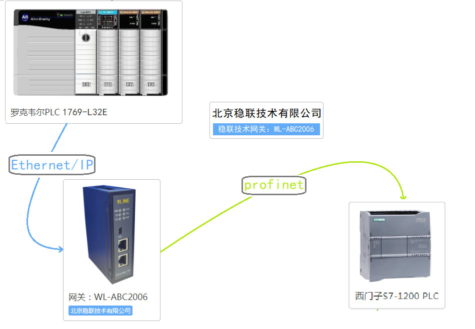 1、羅克韋爾(AB) PLC 1769-L32E以太網(wǎng)通訊(EtherNet/IP)與西門(mén)子S7-1200 PLC(PROFINET)進(jìn)行連接。今天與大家分享一篇EtherNet/IP轉(zhuǎn)PROFINET的通訊配置方案。本文主要介紹穩(wěn)聯(lián)技術(shù)的EtherNet/IP轉(zhuǎn)PROFINET網(wǎng)關(guān)WL-ABC2006,連接西門(mén)子S7-1200 PLC與羅克韋爾(AB) PLC 1769-L32E 通訊的配置過(guò)程,供大家參考。