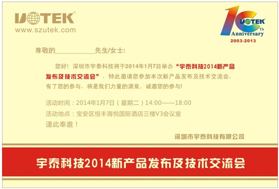 您們好!為了讓更多的新老朋友們對宇泰科技有更深的了解,通過宇泰科技更直觀得了解到最新、最前沿的智能通訊產(chǎn)品及技術(shù)。由深圳市宇泰科技有限公司舉辦的“宇泰科技2014新產(chǎn)品發(fā)布及技術(shù)交流會”誠邀您的參與!