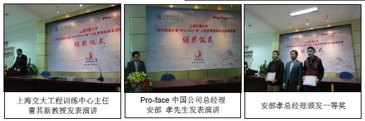上海交通大學(xué)教務(wù)處、團(tuán)委的領(lǐng)導(dǎo)、工程訓(xùn)練中心主任曹其新教授和吳書記以及Pro-face中國公司總經(jīng)理安部孝先生出席頒獎(jiǎng)典禮并做了精彩的演講,在分別為獲獎(jiǎng)的學(xué)生頒獎(jiǎng)之后,本屆競賽圓滿的落下了帷幕。