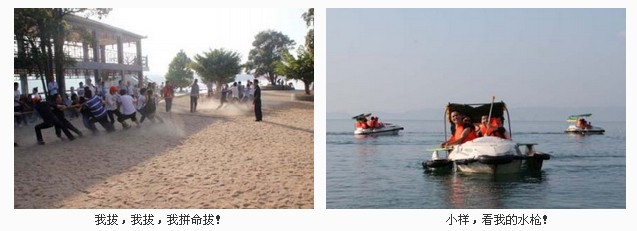 我們?cè)诤系纳碁┥线M(jìn)行了一次友誼拔河比賽,選手和拉拉隊(duì)的熱情,攪得湖水都沸騰了。