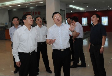 馬正其副局長(前左一)、盧炳輝局長(右一)、吳道聞副市長(后排右二)等領(lǐng)導在聽取何思模董事長(前中)介紹公司產(chǎn)品情況