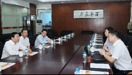 馬正其副局長(左一)、吳道聞副市長(左二)等領(lǐng)導與公司董事長何思模教授(右一)進行交流