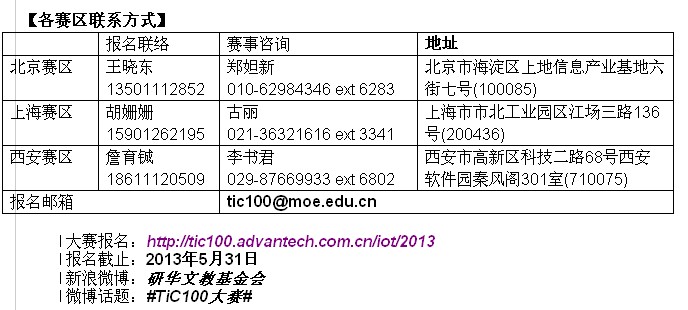 2013年5月2日,由教育部教育管理信息中心主辦,研華文教基金會(huì)、研華科技及中國電信共同協(xié)辦的【2013 TiC100智慧城市與物聯(lián)網(wǎng)創(chuàng)新經(jīng)營模式大賽】(以下簡稱此次大賽)三大賽區(qū)高校籌備會(huì),于4月24日、26日、27日陸續(xù)在西安、上海、北京順利舉辦!