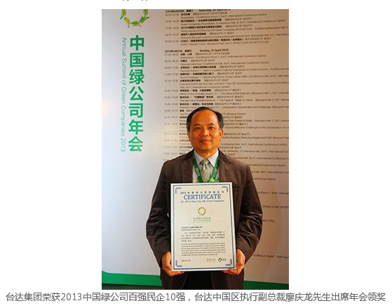 臺(tái)達(dá)集團(tuán)獲選2013中國綠公司百強(qiáng)并榮登民營企業(yè)十強(qiáng),網(wǎng)絡(luò)投票得票數(shù)也位居民企第一位,此為臺(tái)達(dá)第四年進(jìn)入百強(qiáng)榜。由中國企業(yè)家俱樂部及道農(nóng)研究院聯(lián)合主辦的中國綠公司百強(qiáng)年會(huì)及頒獎(jiǎng)典禮,4月20-21日于昆明舉行,臺(tái)達(dá)中國區(qū)執(zhí)行副總裁廖慶龍受邀代表領(lǐng)獎(jiǎng),并于圓桌會(huì)上擔(dān)任領(lǐng)銜佳賓,引導(dǎo)企業(yè)代表探討企業(yè)商譽(yù)及透明度管理。