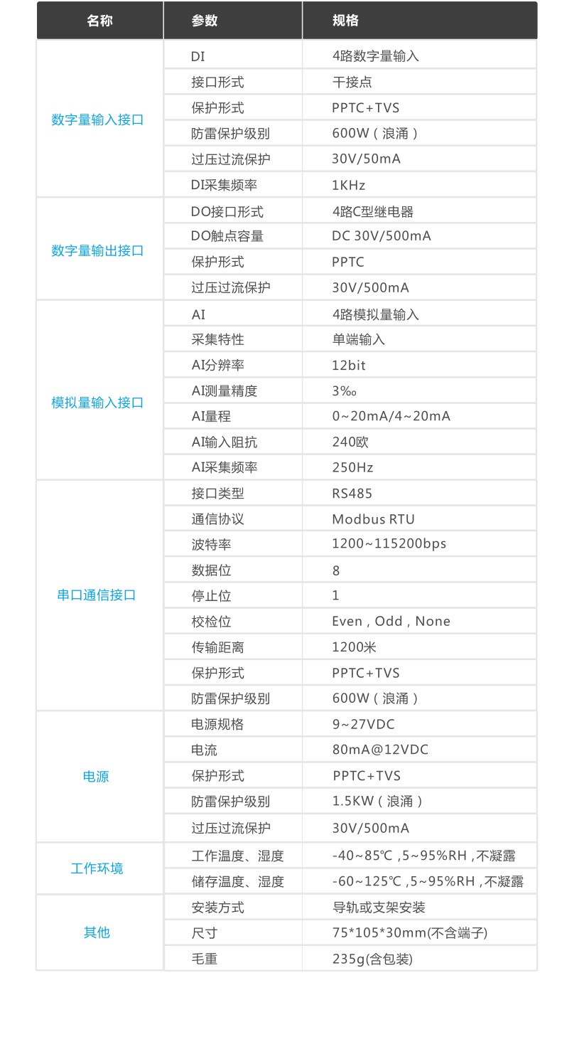 C2000-A2-SMD4440-AE1 是數(shù)字量、模擬量多種輸入的串口采集模塊,其具備良好 的擴展性,可靈活地通過自帶的 RS485 總線級聯(lián)康耐德同系列串口 I/O 聯(lián)網(wǎng)設備,以實 現(xiàn)各種數(shù)字量、模擬量的組合、擴展采集的功能。 本產(chǎn)品采用標準 Modbus RTU 通訊協(xié)議,適合各類工業(yè)監(jiān)控的現(xiàn)場應用。本產(chǎn)品支 持 C2000 設備管理監(jiān)控軟件,同時也可輕松地實現(xiàn)與第三方 SCADA 軟件、PLC、HMI 設備整合應用。 特點: 1800 2579 623 →4 路數(shù)字量輸入,可采集低速脈沖并計數(shù); →4 路數(shù)字量輸出,輸出可設置電平、脈沖兩種方式; →4 路 0-20/4-20mA 電流輸入; →采用 Modbus RTU 通訊協(xié)議; →電源具有良好的過流、過壓、防反接、防錯接保護功能; →豐富的指示燈,全面查看狀態(tài),及時排查故障; →安裝便捷,支持導軌安裝及表面安裝; →低功耗設計,無需散熱裝置; →支持寬溫環(huán)境應用(-40 ~ 85 ℃); →提供 6 年質(zhì)保服務。