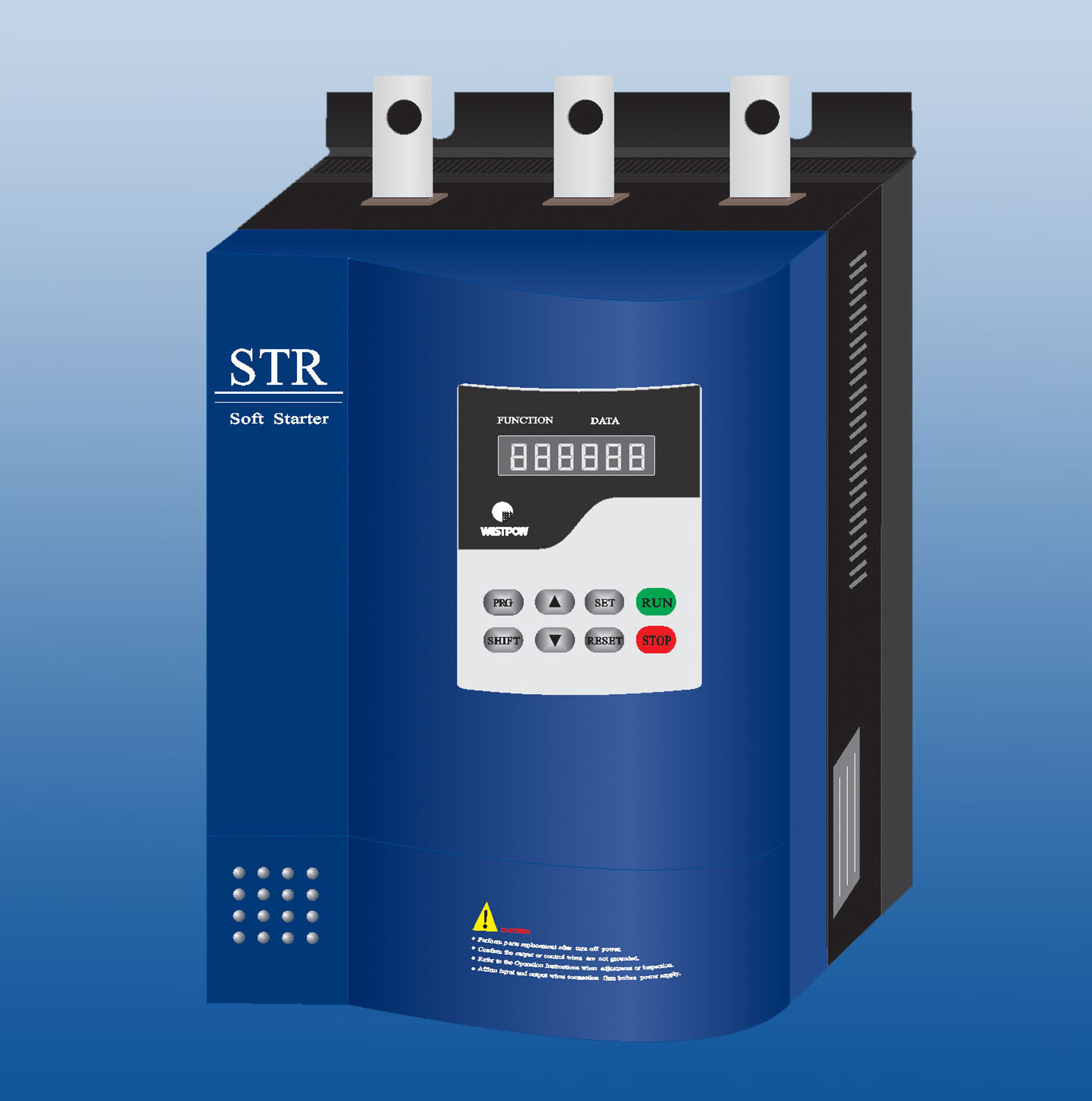 STR系列B型電動機(jī)軟起動器.是具有多種保護(hù)功能的軟起動單元,適用于風(fēng)機(jī)、水泵、傳送帶及重負(fù)載起動,結(jié)構(gòu)為壁掛式,其主電路有九個接線端子,除R.S.T.(電源進(jìn)線)U.V.W.(接三相電機(jī))外,還有U1.V1.W1.三個外接旁路接觸器的專用端子,同時還預(yù)留有外部起動、停止、故障、復(fù)位、旁路控制、起動完成等接口,因此非常適用于開關(guān)柜廠或集成配套商選用。STR系列B型軟起動器外接旁路接觸器后仍對電機(jī)有保護(hù)功能,所以不需另加電機(jī)保護(hù)元件。其基本接線原理圖詳見下圖。用B型軟起動器作為起動元件成套為G型軟起動控制柜.