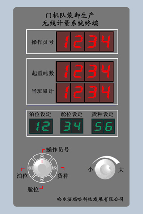 人機(jī)接口面板如圖2所示,操作員編號、起重噸數(shù)、累計(jì)重量采用大數(shù)碼管顯示,主要考慮較遠(yuǎn)的距離也能觀察到。艙位、泊位及貨種顯示用小數(shù)碼管顯示,這些信息在工作前要操作儀器進(jìn)行調(diào)整,所以只要在較近距離能夠看到就可以了,并且用綠色顯示管顯示。