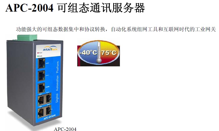 APC-2004是新一代具備應用層協(xié)議轉(zhuǎn)換和數(shù)據(jù)集中能力的高性能可組態(tài)通訊服務器。APC-2004采用新一代工業(yè)級高性能、低功耗嵌入式Power PC處理器、自動化專用操作系統(tǒng)和創(chuàng)新設計的高性能嵌入式防雪崩軟件技術。APC-2004功能完善、性能優(yōu)越的數(shù)據(jù)采集、數(shù)據(jù)集中和數(shù)據(jù)轉(zhuǎn)發(fā)功能,并可配合DCM系列產(chǎn)品共同構成分布式自動化系統(tǒng)實現(xiàn)對傳統(tǒng)工控機+組態(tài)軟件解決方案的完全取代,從而取得更高的可靠性和更好適應各種自動化應用現(xiàn)場的能力,是新一代基于網(wǎng)絡、無人值守、遠程集中監(jiān)控自動化系統(tǒng)的理想選擇。