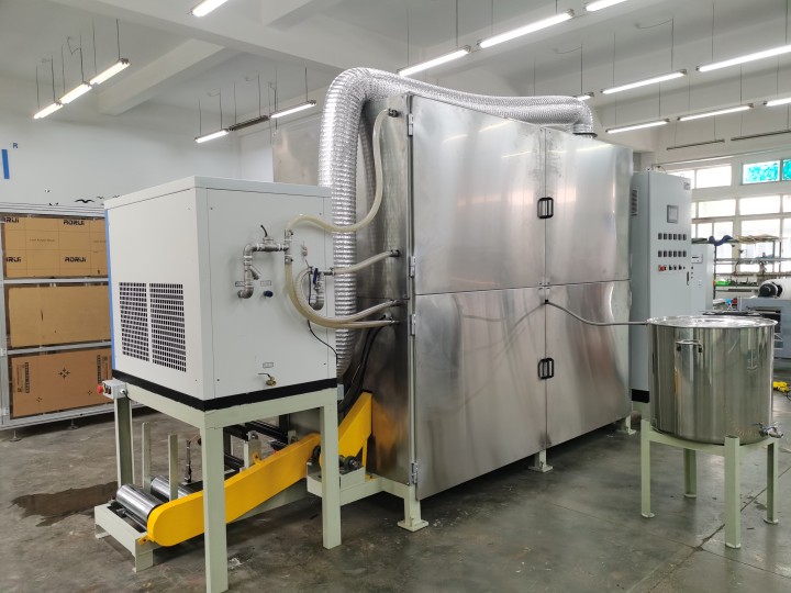 以煤油為助劑生產(chǎn)加工的產(chǎn)品,烘干助劑產(chǎn)生的油氣,對空氣排放,既對環(huán)境造成污染又增加了企業(yè)成本。我公司聯(lián)合生料帶企業(yè),反復測試,特開發(fā)此設備,對煤油助劑進行回收和重復利用。 為了響應環(huán)保要求,本公司研制成功了高效的煤油回收系統(tǒng),解決了生料帶行業(yè)煤油自然排放,污染空氣的難題。本系統(tǒng)集機電一體化等高難技術,使回收率和空間率達到提高。 產(chǎn)品特點: 1.采用全新的變頻控制技術,整機平穩(wěn)運行功耗更低; 2.整機一體式設計,節(jié)省空間,安裝與操作更加簡單; 3.采用我司專利回收方案(專利號:ZL 2016 2 0059331.7), 煤油回收效率更高; 4.采用接觸式傳導加熱技術,十到二十分鐘即可達到生產(chǎn)溫度; 5.每套加熱滾筒獨立控制啟停和溫度,提高設備穩(wěn)定性; 6.采用先進的收卷冷凝降溫技術,防止收卷后溫度過高而粘連; 7.加熱倉體加裝防爆裝置,確保整機安全運行; 8.三級過濾體系,使VOC數(shù)值達到環(huán)保排放要求;收集煤油清潔無雜質可循環(huán)用于生產(chǎn); 9.可根據(jù)料帶寬度定制雙卷模式,進一步提高生產(chǎn)效率; 10.完善的出廠測試程序,每臺機器進行實際脫油操作,確保達到客戶要求; 11.人性化操作設置,一定程度實現(xiàn)自動化控制,省時省力。 主要用途: 1.生料帶生產(chǎn)加工企業(yè) 2.以煤油為助劑及其他生產(chǎn)加工企業(yè) 規(guī)格參數(shù): 型號 | RX-HS-VO1 | 生產(chǎn)效率 | 約50KG/小時 | 電源 | 三相380V40KW | 運行功率 | 約10KW | 機器重量 | 1500KG | 備注:運行功率因客戶產(chǎn)品厚薄的不同略有浮動。 |