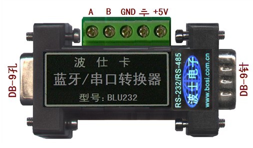 BLU232的RS-232/485串口有2個(gè)用處:1、在傳輸模式下作為藍(lán)牙轉(zhuǎn)換出來的串口,2、在設(shè)置模式下用于對BLU232產(chǎn)品進(jìn)行設(shè)置。注意BLU232有DB-9孔和DB-9針的RS-232口,它們實(shí)質(zhì)上是同一個(gè)口,僅僅是為了方便用戶的使用。BLU232的DB-9孔可以自己外插計(jì)算機(jī)的RS-232針座,同時(shí)BLU232的DB-9針座與計(jì)算機(jī)的RS-232針座的引腳分配完全一樣,所以可以直接插RS-232設(shè)備。BLU232的RS-232口只有RXD、TXD、GND三線信號(hào)。RS-485信號(hào)的參考地線與RS-232的GND是一樣的、與外接5V電源的GND也是一樣的。RS-485口帶600W浪涌保護(hù)。