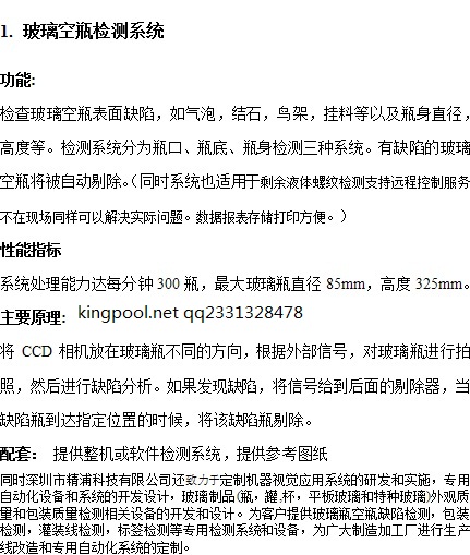 同時深圳市精浦科技有限公司還致力于定制機器視覺應(yīng)用系統(tǒng)的研發(fā)和實施,專用自動化設(shè)備和系統(tǒng)的開發(fā)設(shè)計,玻璃制品(瓶,罐,杯,平板玻璃和特種玻璃)外觀質(zhì)量和包裝質(zhì)量檢測相關(guān)設(shè)備的開發(fā)和設(shè)計。為客戶提供玻璃瓶空瓶缺陷檢測,包裝檢測,灌裝線檢測,標簽檢測等專用檢測系統(tǒng)和設(shè)備,為廣大制造加工廠進行生產(chǎn)線改造和專用自動化系統(tǒng)的定制。質(zhì)優(yōu)價惠,歡迎咨詢。 |