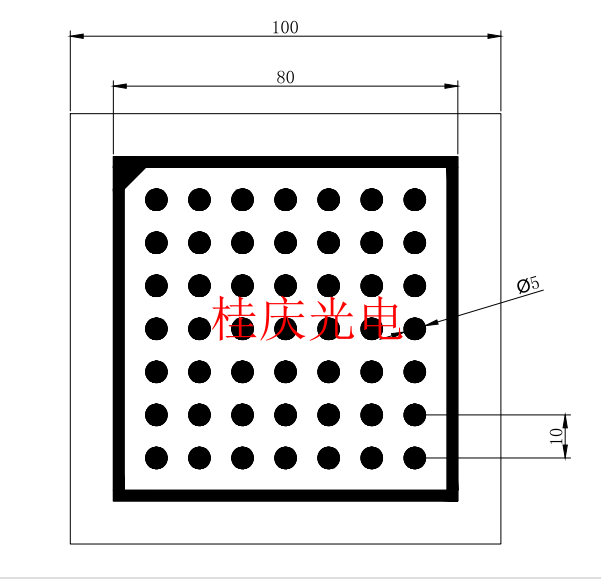 | 產(chǎn)品型號 | 圖形尺寸 | 圓點(diǎn)直徑 | 中心距 | 陣列 | | GQ-H5-0.3125 | 5*5 | 0.3125 | 0.625 | 7*7 | | GQ-H8-0.5 | 8*8 | 0.5 | 1 | 7*7 | | GQ-H10-0.625 | 10*10 | 0.625 | 1.25 | 7*7 | | GQ-H15-0.9375 | 15*15 | 0.9375 | 1.875 | 7*7 | | GQ-H20-1.25 | 20*20 | 1.25 | 2.5 | 7*7 | | GQ-H25-1.5625 | 25*25 | 1.5625 | 3.125 | 7*7 | | GQ-H30-1.875 | 30*30 | 1.875 | 3.75 | 7*7 | | GQ-H64-4 | 64*64 | 4 | 8 | 7*7 | | GQ-H100-6.25 | 100*100 | 6.25 | 12.5 | 7*7 | | GQ-H150-9.375 | 150*150 | 9.375 | 18.75 | 7*7 | | 以上是常用規(guī)格,可按照圖紙要求訂做 |