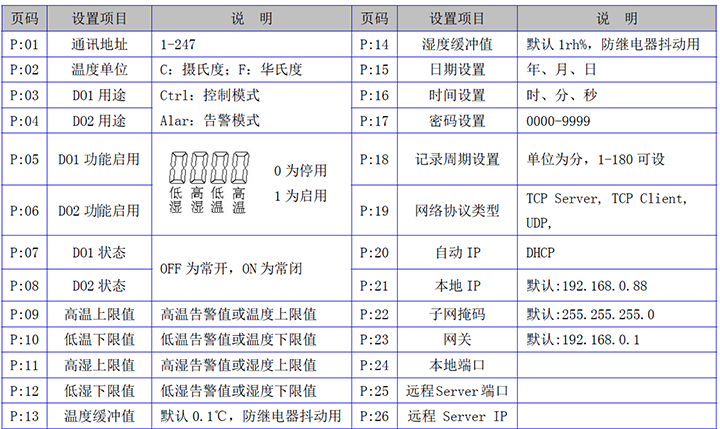 五、操作說明 在初始頁面下,按“向上”“向下”鍵可以切換顯示:Td(露點)、ID(地址)、DO1(第一路開關(guān)量狀態(tài))、DO2(第二路開關(guān)量狀態(tài))、Date(日期月:日)和時間(時:分)。 設(shè)置操作:在初始頁面下,按“SET”鍵提示輸入密碼,初始密碼為“0000”,此時閃動的位按“向上”“向下”鍵可以進行調(diào)整,按“SET”鍵可以移位,輸入正確密碼后按下“ENTER”鍵即可進入設(shè)置頁面,參數(shù)設(shè)置頁面共有26頁,按“向上”“向下”鍵可以選擇需要設(shè)置的項目,按下“ENTER”鍵可以設(shè)置當(dāng)前項目的參數(shù),參數(shù)調(diào)整OK后,按下“ENTER”鍵保存設(shè)置,再按“SET”鍵可返回到初始頁面。