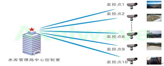 該系統(tǒng)主要由三部分組成,前端視頻、語(yǔ)音、數(shù)據(jù)等采集系統(tǒng),無(wú)線網(wǎng)絡(luò)傳輸系統(tǒng),水庫(kù)管理中心控制系統(tǒng)。前端的多路視頻、數(shù)據(jù)及IP電話等都先通過(guò)交換機(jī)進(jìn)行匯聚,然后進(jìn)入艾克賽爾(Axelwave)的無(wú)線網(wǎng)橋進(jìn)行無(wú)線傳輸,所有前端點(diǎn)都采用太陽(yáng)能供電系統(tǒng)供電,在陰雨條件下可以支持連續(xù)工作72小時(shí)以上。中心水庫(kù)管理控制室與前端組成點(diǎn)對(duì)多點(diǎn)的無(wú)線傳輸鏈路,將前端的所有信息匯總至控制室。控制中心可以實(shí)時(shí)監(jiān)控各前端點(diǎn)的視頻圖像,如水庫(kù)水位情況,閘門(mén)、大壩的工作狀態(tài),水面及岸邊情況等等,另外還能觀察到前端發(fā)回各種的實(shí)時(shí)數(shù)據(jù)信息,如水庫(kù)水質(zhì)變化、水庫(kù)天氣變化等,真正做到對(duì)水庫(kù)各重點(diǎn)區(qū)域的全天候、多角度、全方位的實(shí)時(shí)監(jiān)控,做到有效應(yīng)對(duì)各種突發(fā)事件,確保了水庫(kù)各方面的安全運(yùn)行。
