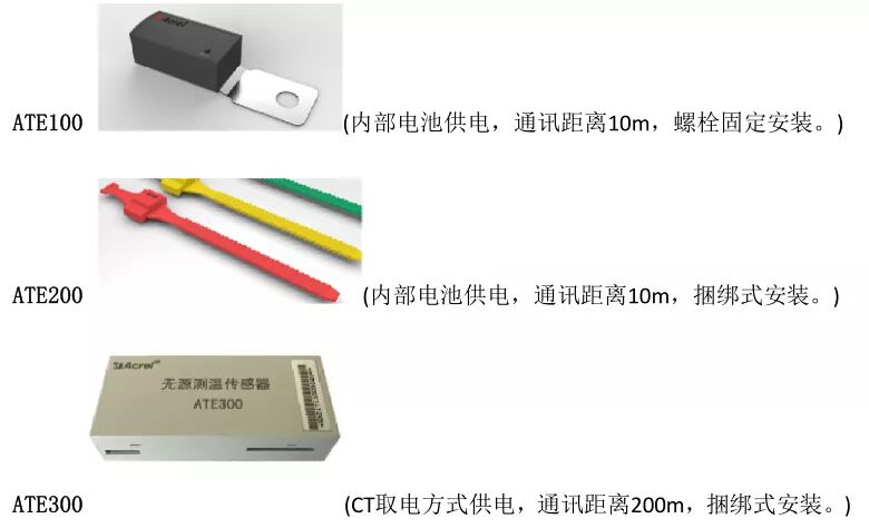 說明:ARTM-Pn 無線測溫裝置最多可連接 18 路無線溫度傳感器,無源(CT 取電)方式為 ATE300(捆綁式安裝),有源(電池供電)方式為 ATE100(螺栓式安裝,主要用于電纜/銅排等螺絲固定的搭接點)和 ATE200(表帶式,主要用于斷路器觸頭等接點捆綁安裝,因安裝較 ATE100 更方便,電纜/銅排等搭接點也常選用)。