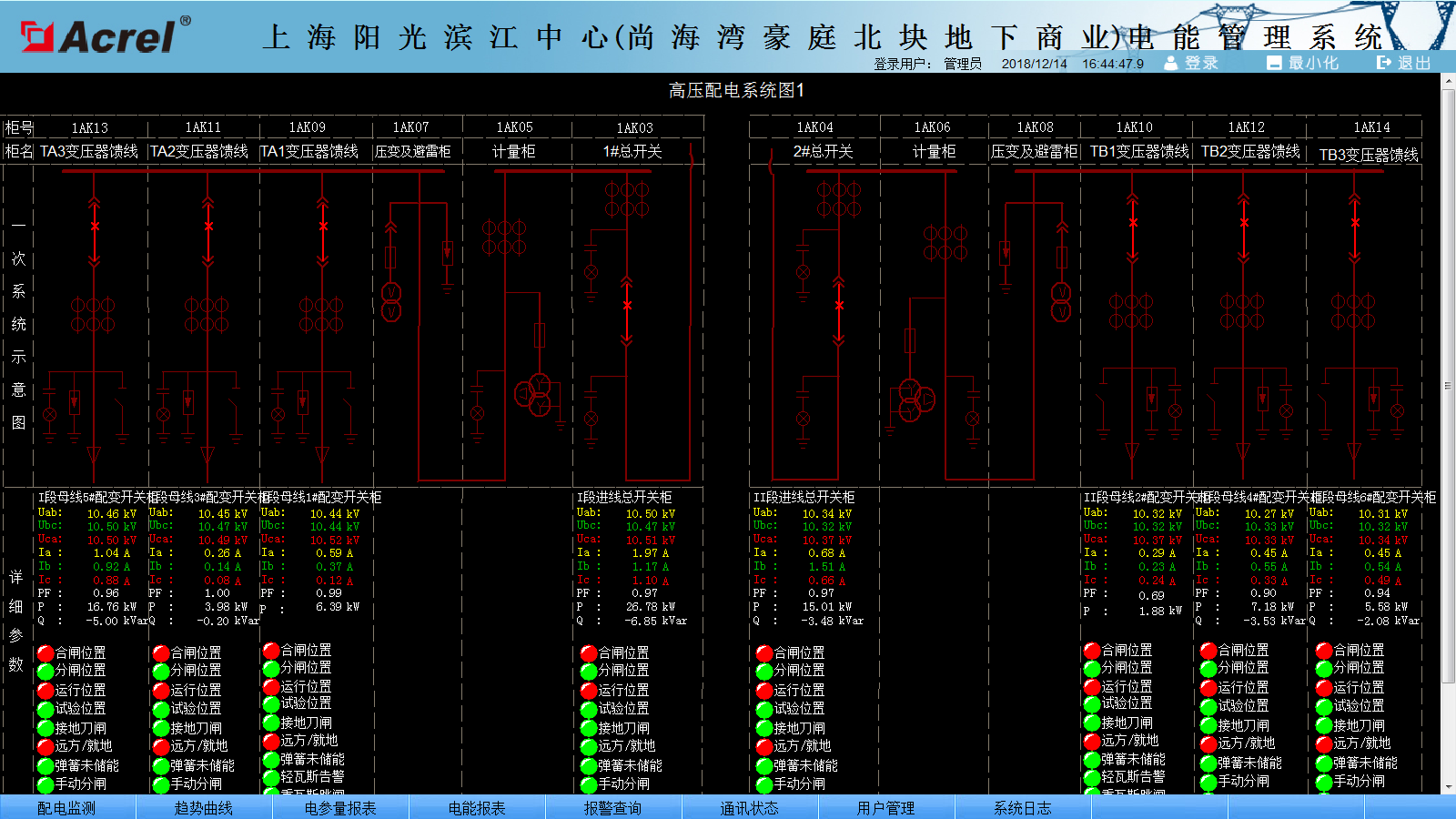 實(shí)時(shí)監(jiān)控系統(tǒng)圖為主監(jiān)控畫面,主要實(shí)時(shí)監(jiān)測(cè)變電所所有回路的運(yùn)行狀態(tài),紅色代表合閘,綠色代表分閘。在系統(tǒng)圖中可以直觀的看到每路進(jìn)線和出線的運(yùn)行參數(shù)和狀態(tài),可以看到變壓器出線側(cè)的所有常規(guī)電力參數(shù),如:三相電壓、電流、有功功率、無功功率、功率因數(shù)、頻率、有功電度等。如下圖所: