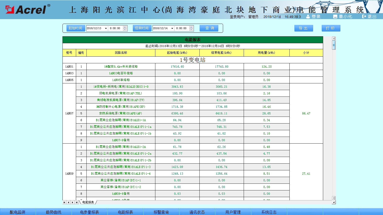 用電量報(bào)表功能,可選擇時(shí)間段進(jìn)行查詢,支持任意時(shí)間段電度累計(jì)查詢,具備數(shù)據(jù)導(dǎo)出和報(bào)表打印等功能。為值班人員提供了準(zhǔn)確可靠的電能報(bào)表。該報(bào)表各回路名稱和數(shù)據(jù)庫關(guān)聯(lián),方便用戶修改回路名稱。如下圖所示,用戶可以直接打印報(bào)表,可以以EXCEL格式另存到其他位置。 如下圖所示: