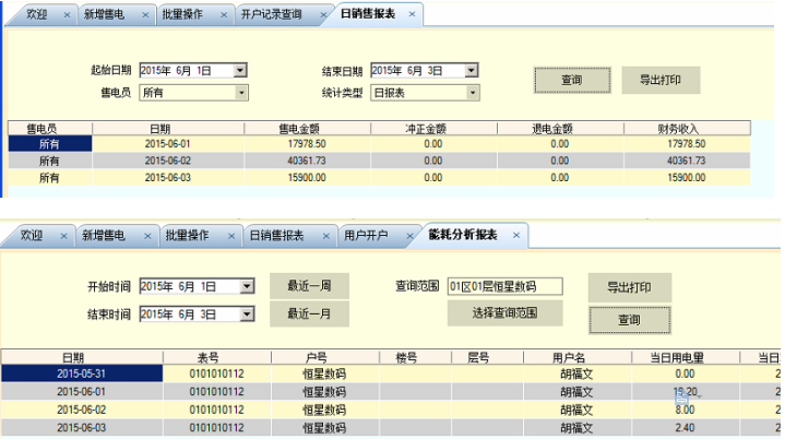 系統(tǒng)還提供了多個(gè)報(bào)表以供查詢(xún),分別是日/月/年財(cái)務(wù)銷(xiāo)售統(tǒng)計(jì)報(bào)表、失聯(lián)表/通訊管理機(jī)查詢(xún)報(bào)表、能耗查詢(xún)報(bào)表、實(shí)時(shí)報(bào)警/歷史報(bào)警查詢(xún)報(bào)表,支持導(dǎo)出。以下是財(cái)務(wù)報(bào)表和預(yù)付費(fèi)表日用能查詢(xún)報(bào)表: