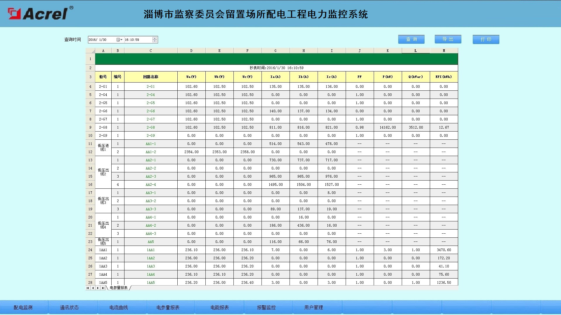 參數(shù)抄表功能,主要對低壓各出線回路的電參數(shù)進線查詢。支持任意時刻電參數(shù)查詢,具備數(shù)據(jù)導出和報表打印等功能。該報表查詢供兩個變電所4臺變壓器出線各低壓回路的電參數(shù),主要包括:三相電流、有功功率和有功電度及變壓器溫度。該報表各回路名稱和數(shù)據(jù)庫關聯(lián),方便用戶修改回路名稱。見圖(2)。