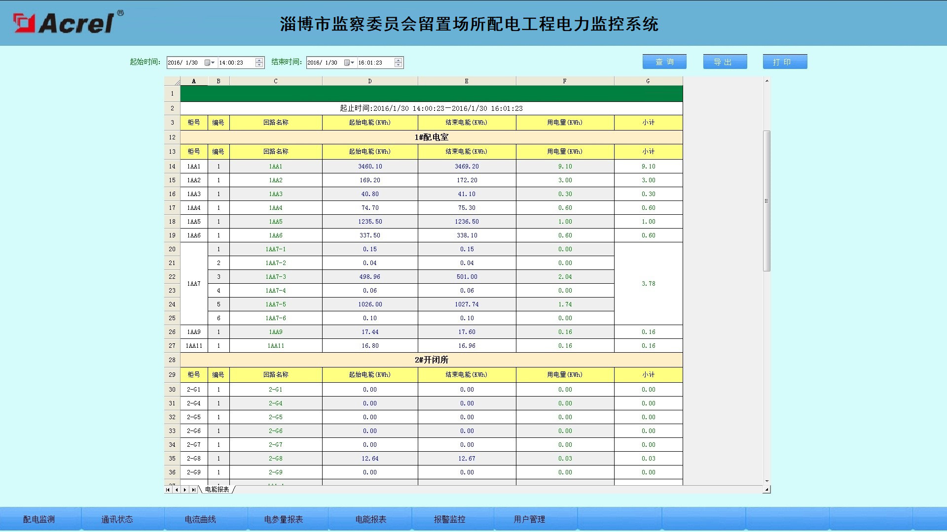 報表具有自由設置查詢時間實現(xiàn)日、月、年的電能統(tǒng)計,數(shù)據(jù)導出和報表打印等功能。