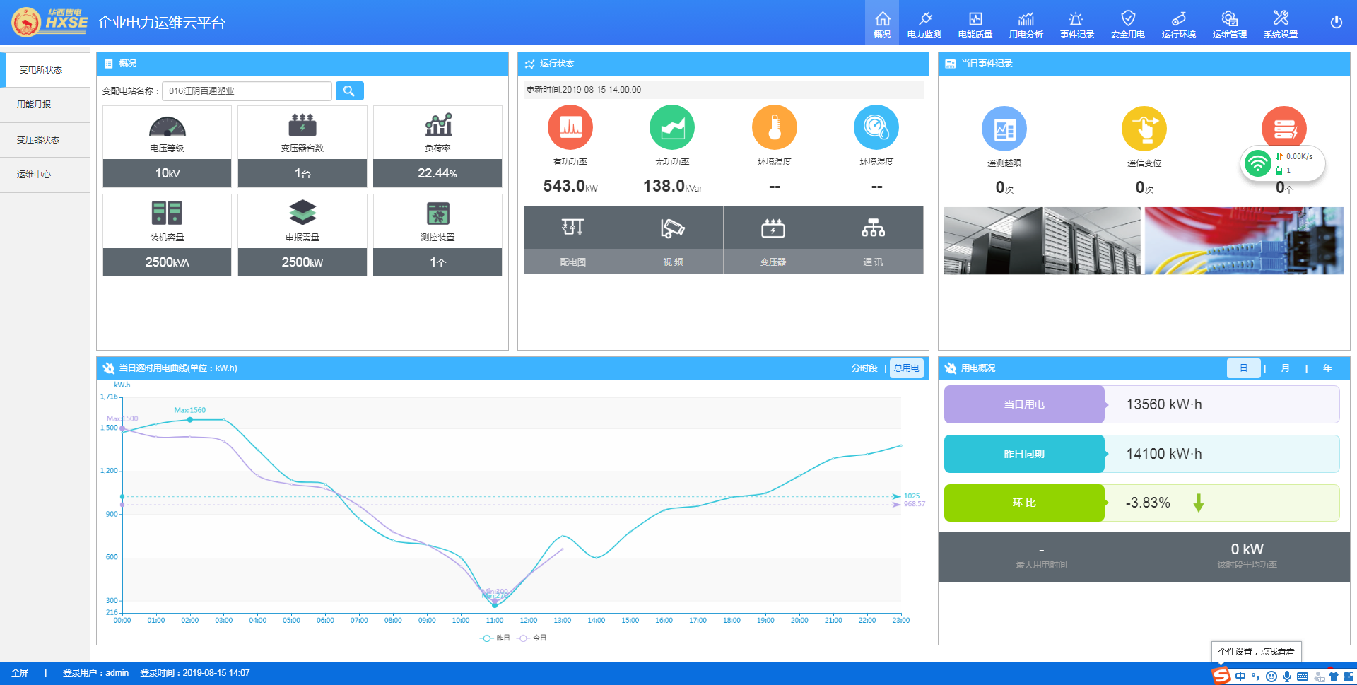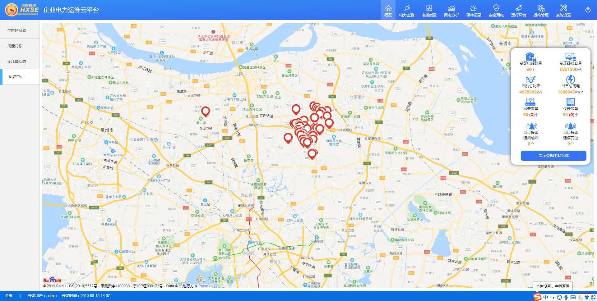 平臺首頁為變電所概況,包括變電所狀態(tài)、地圖導(dǎo)航和用能月報(bào)。變電所狀態(tài)包括:變電所概況、運(yùn)行狀態(tài)、當(dāng)日事件記錄、當(dāng)日逐時(shí)用電曲線、用電概況。