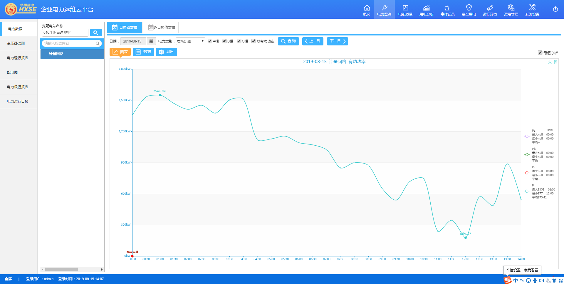 電力數(shù)據(jù)顯示變電所各回路的電力數(shù)據(jù)和曲線,包括電流、相電壓、線電壓、頻率、功率因數(shù)、有功功率、無功功率、視在功率等參數(shù),并可導(dǎo)出圖表。