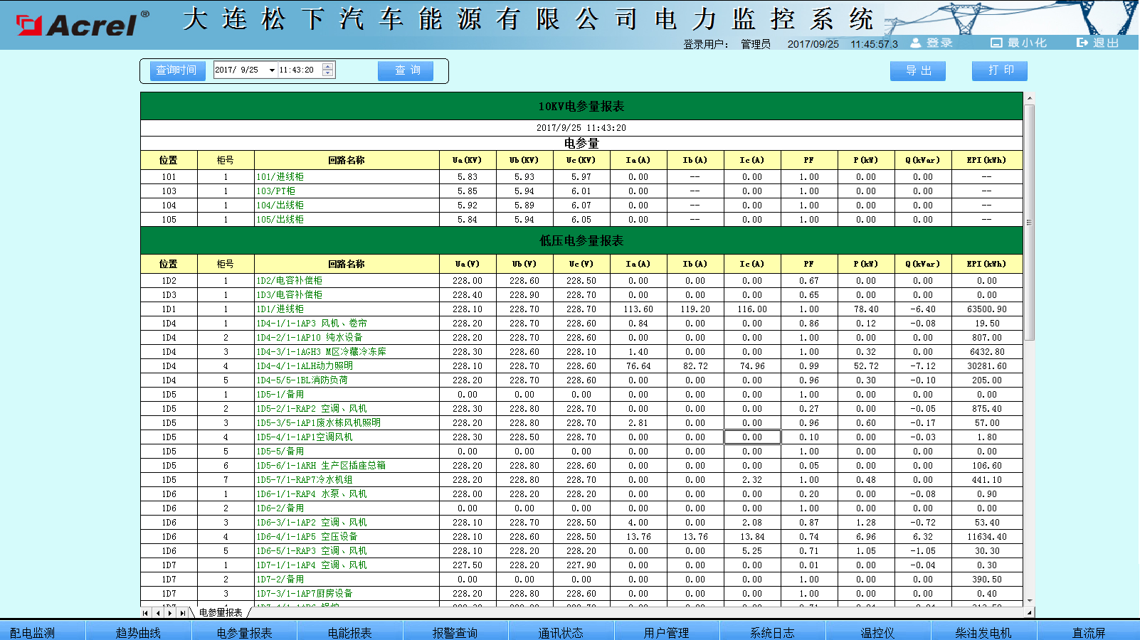 參數(shù)抄表功能,主要對低壓各出線回路的電參數(shù)進線查詢。支持任意時刻電參數(shù)查詢,具備數(shù)據(jù)導(dǎo)出和報表打印等功能。該報表查詢供變電所4臺變壓器出線各低壓回路的電參數(shù),主要包括:三相電流、有功功率和有功電度及變壓器溫度。該報表各回路名稱和數(shù)據(jù)庫關(guān)聯(lián),方便用戶修改回路名稱。見圖(4)。