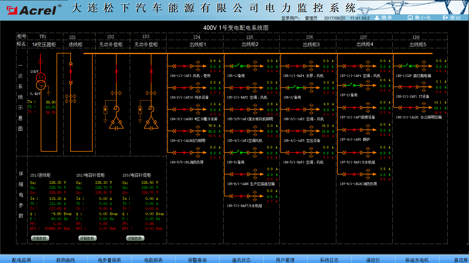 系統(tǒng)提供簡單、易用、良好的用戶使用界面。采用全中文界面,CAD圖形顯示低壓配電系統(tǒng)電氣一次主接線圖,顯示配電系統(tǒng)設(shè)備狀態(tài)及相應(yīng)實時運行參數(shù),畫面定時輪巡切換;畫面實時動態(tài)刷新;模擬量顯示;開關(guān)量顯示;連續(xù)記錄顯示等。