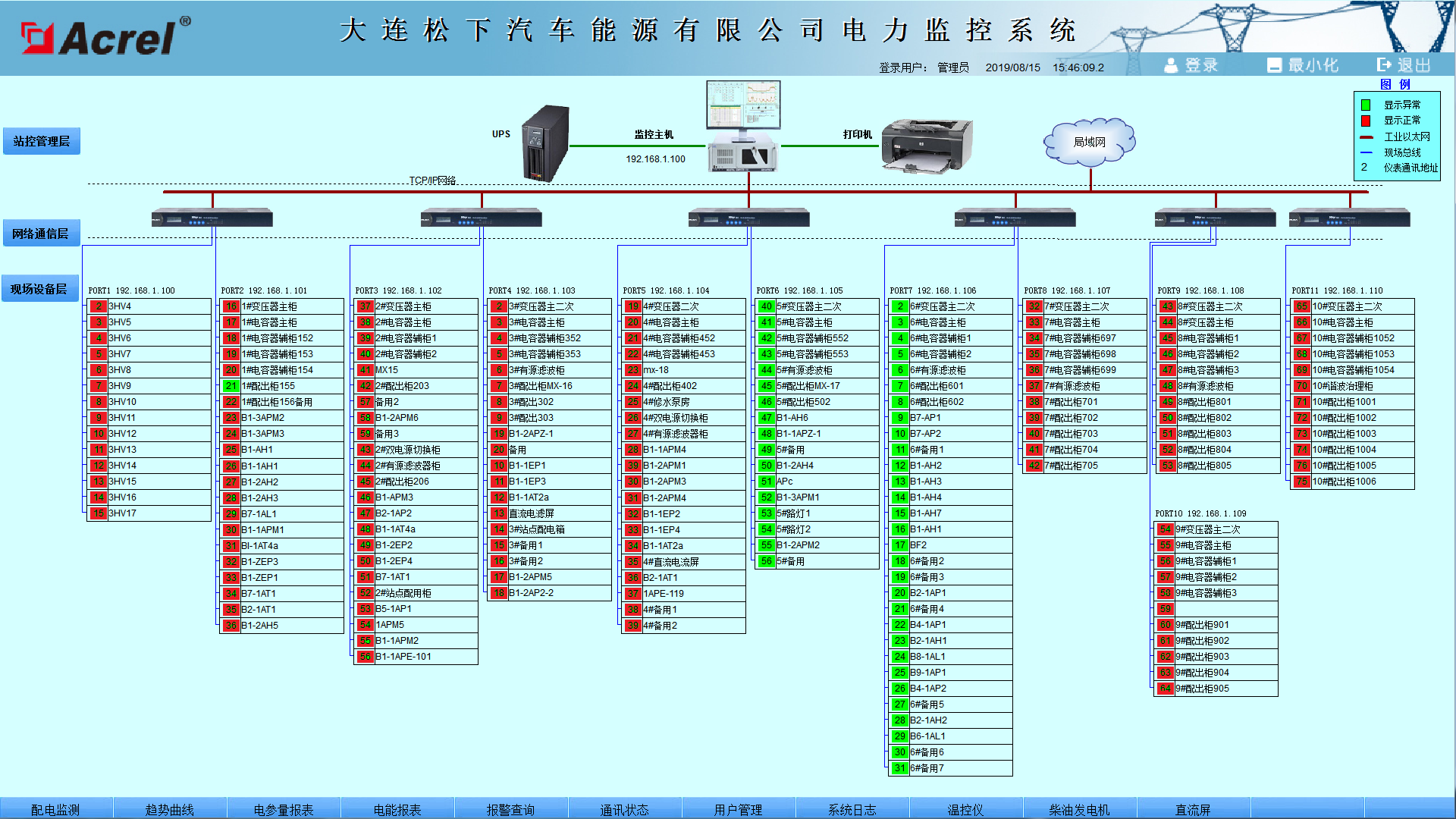 隨著社會的發(fā)展及電力的廣泛應(yīng)用,電力監(jiān)控系統(tǒng)已成為全國各地重點工程項目、標志性建筑/大型公共設(shè)施等大面積多變電所用戶的必然選擇,本文介紹的Acrel-2000電力監(jiān)控系統(tǒng)在大連華誼汽車產(chǎn)業(yè)配套園二期工程項目的應(yīng)用,可以實現(xiàn)對變電所高低壓配電回路用電的實時監(jiān)控與電能管理,不僅能顯示回路用電狀況,還具有網(wǎng)絡(luò)通訊功能,可以與串口服務(wù)器、計算機等組成電力監(jiān)控系統(tǒng)。系統(tǒng)實現(xiàn)對采集數(shù)據(jù)的分析、處理,實時顯示變電所內(nèi)各配電回路的運行狀態(tài),對分合閘、負載越限具有彈出報警對話框及語音提示,并生成各種電能報表、分析曲線、圖形等,便于電能的遠程抄表以及分析、研究。該系統(tǒng)運行安全、可靠、穩(wěn)定,為變電所用戶解決用電問題提供了真實可靠的依據(jù),取得了較好的社會效益。[2]
