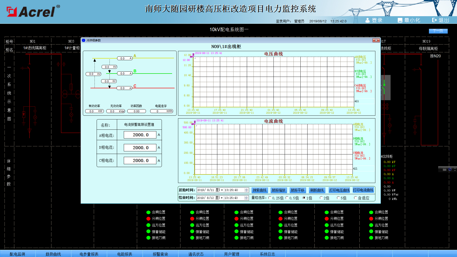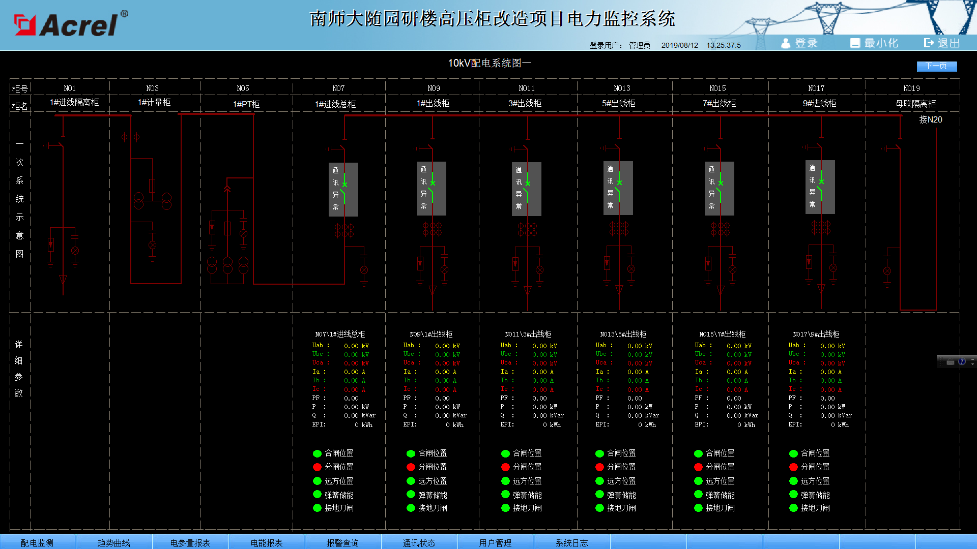隨著社會(huì)的發(fā)展及電力的廣泛應(yīng)用,電力監(jiān)控系統(tǒng)已成為全國(guó)各地重點(diǎn)工程項(xiàng)目、標(biāo)志性建筑/大型公共設(shè)施等大面積多變電所用戶的必然選擇,本文介紹的Acrel-2000電力監(jiān)控系統(tǒng)在南師大隨園研樓高壓柜改造項(xiàng)目的應(yīng)用,可以實(shí)現(xiàn)對(duì)變電所低壓配電回路用電的實(shí)時(shí)監(jiān)控與電力監(jiān)控,不僅能顯示回路用電狀況,還具有網(wǎng)絡(luò)通訊功能,可以與串口服務(wù)器、計(jì)算機(jī)等組成電力監(jiān)控系統(tǒng)。系統(tǒng)實(shí)現(xiàn)對(duì)采集數(shù)據(jù)的分析、處理,實(shí)時(shí)顯示變電所內(nèi)各配電回路的運(yùn)行狀態(tài),對(duì)分合閘、負(fù)載越限具有彈出報(bào)警對(duì)話框及語(yǔ)音提示,并生成各種電能報(bào)表、分析曲線、圖形等,便于電能的遠(yuǎn)程抄表以及分析、研究。該系統(tǒng)運(yùn)行安全、可靠、穩(wěn)定,為變電所用戶解決用電問(wèn)題提供了真實(shí)可靠的依據(jù),取得了較好的社會(huì)效益.
