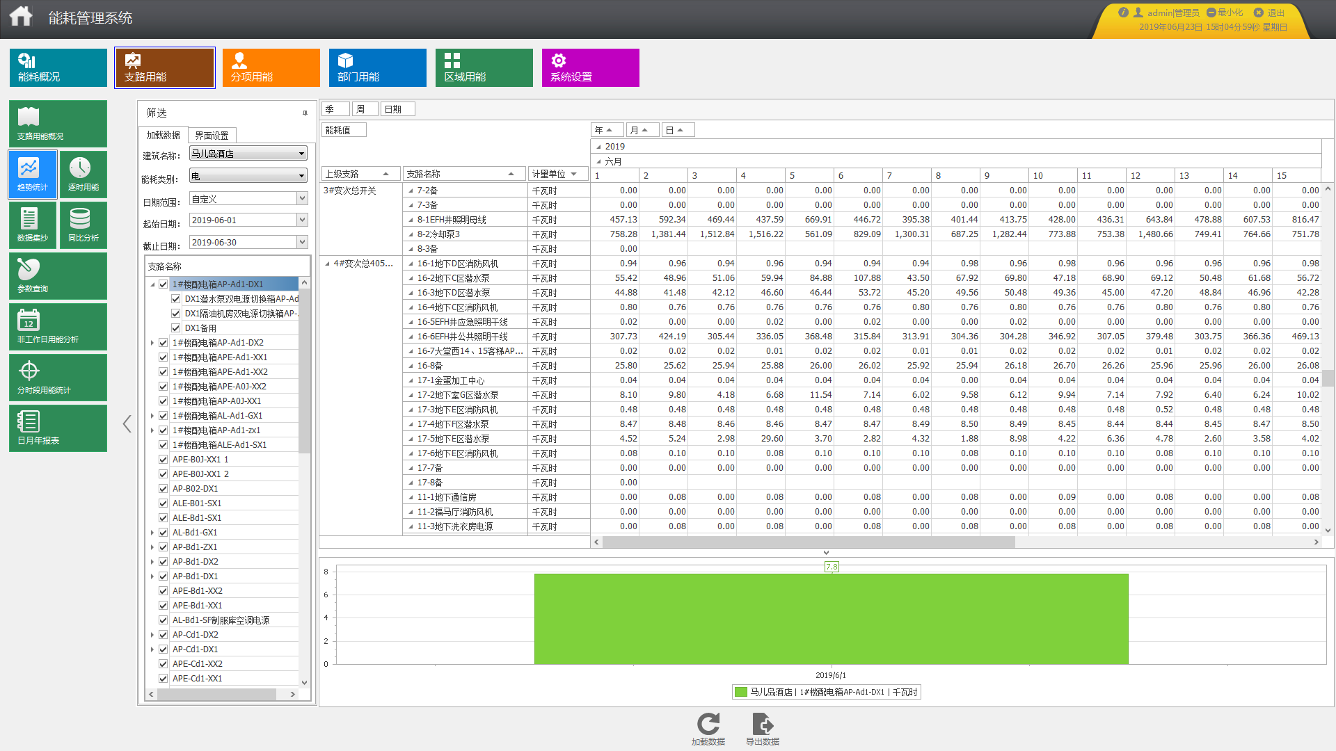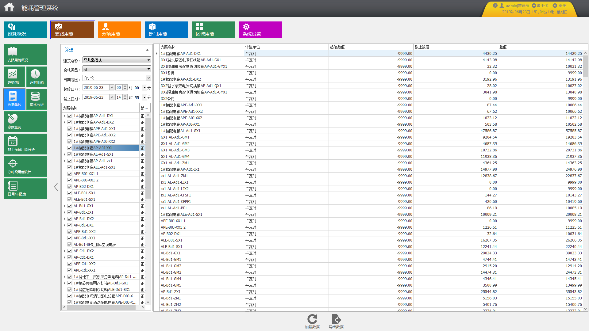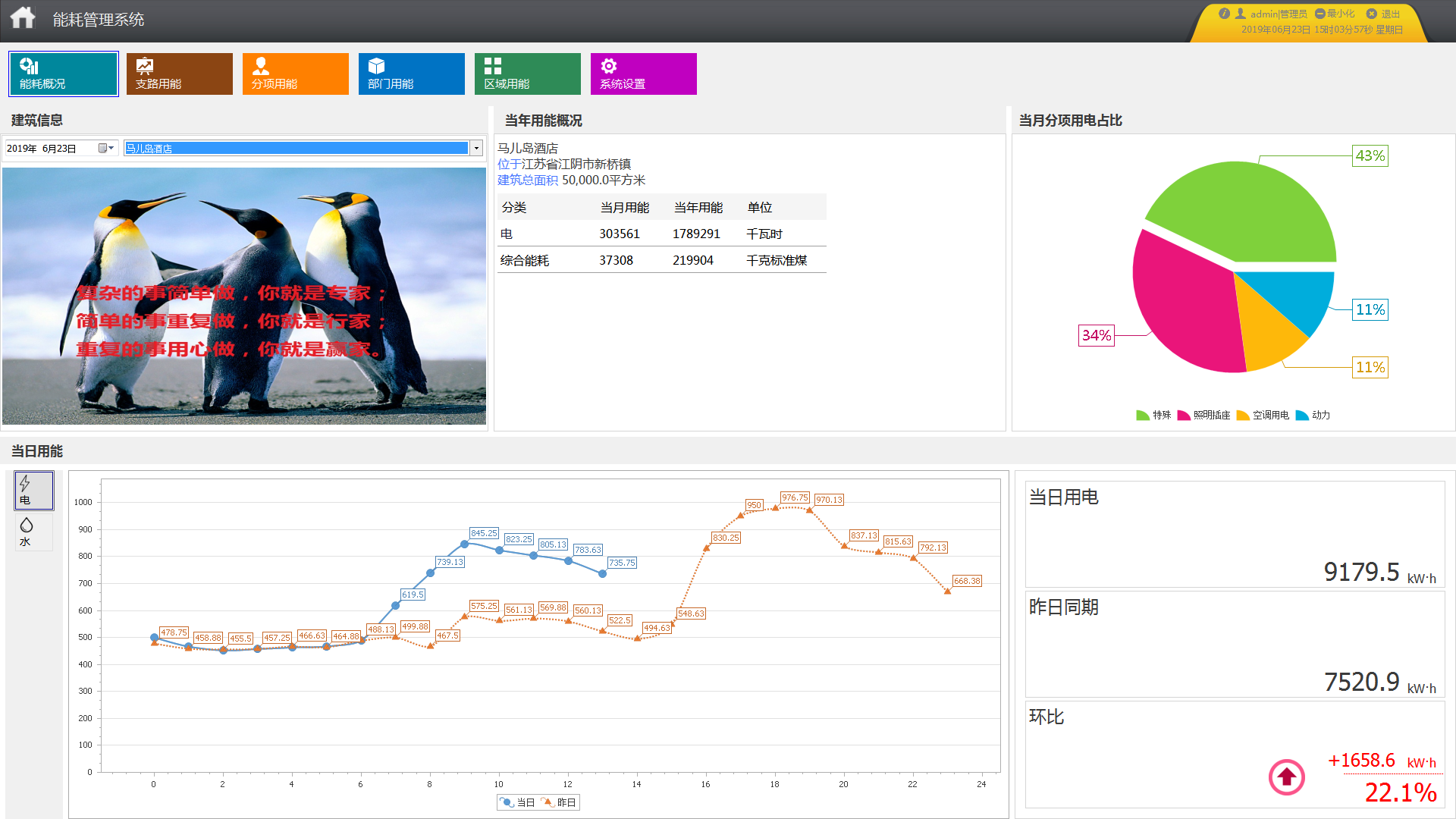 反映建筑物當(dāng)年用能各分類能耗和折算為標(biāo)準(zhǔn)煤的綜合能耗,并計(jì)算得到單位面積能耗;建筑物中的能耗分類雖然較多,但是能通過表計(jì)計(jì)量的主要有電、水,界面下方顯示這兩類能耗的當(dāng)日逐時用能曲線;