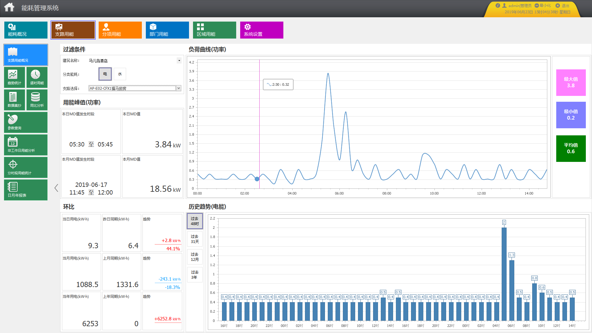 顯示當(dāng)日和當(dāng)月的用能峰值(電能對應(yīng)最大需量值)。顯示當(dāng)日用能、當(dāng)月用能、當(dāng)年用能與昨日同期用能、上月同期用能、上年同期用能的比較情況。藍(lán)色帶負(fù)號表示當(dāng)前日期比以往同期能耗值低,紅色字體說明當(dāng)前日期超過以往同期能耗值。以條形顯示過去48小時、31天、12個月、3年的能耗情況。右上角顯示過去15分鐘曲線(電表顯示功率曲線,流量表顯示流速曲線),同時顯示當(dāng)前值與15分鐘內(nèi)的最大值和最小值。