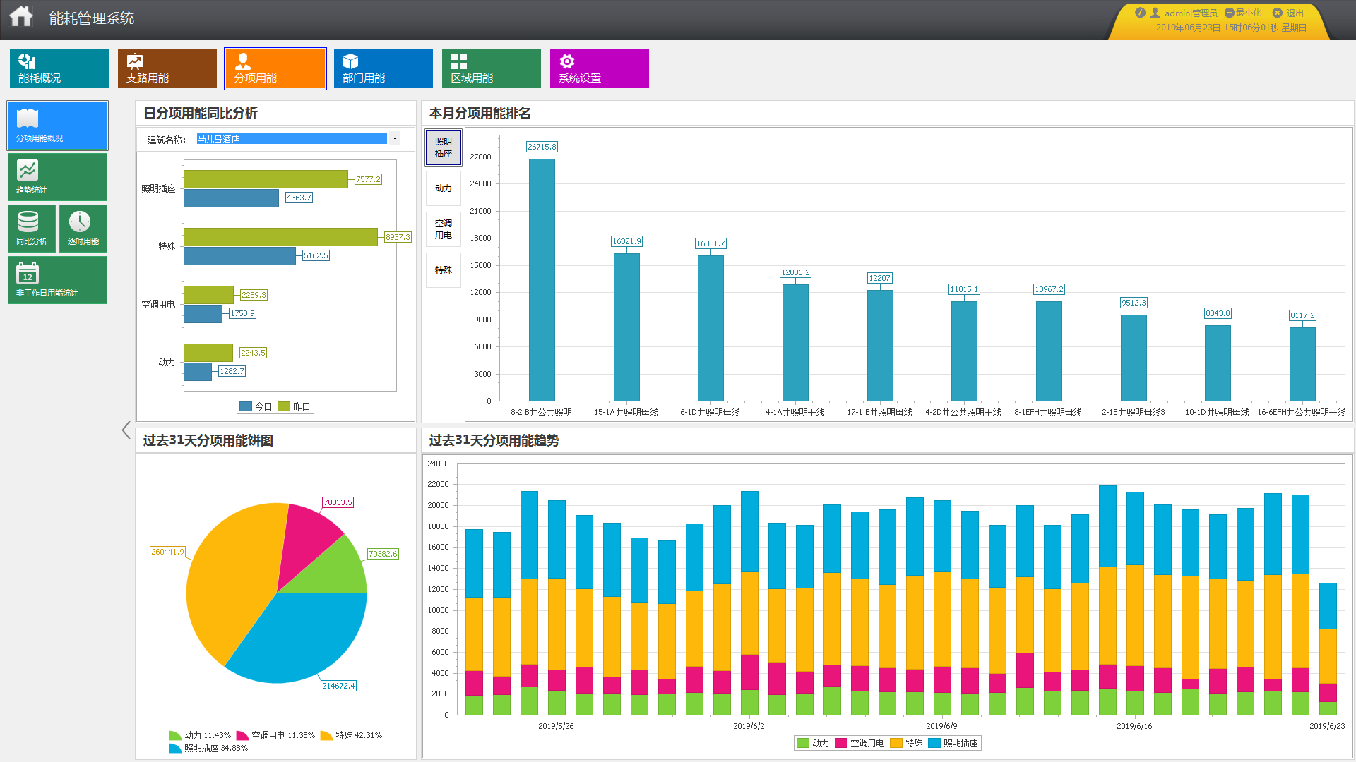 按照區(qū)域進(jìn)行能耗統(tǒng)計(jì)與顯示。日分項(xiàng)用能同比分析圖顯示不同區(qū)域的當(dāng)日與昨日能耗柱狀圖(藍(lán)色柱表示今日,綠色柱表示昨日)。以餅圖顯示各區(qū)域過去31天的用能占比,以右側(cè)堆積圖和柱狀圖顯示各區(qū)域過去31天的能耗趨勢。