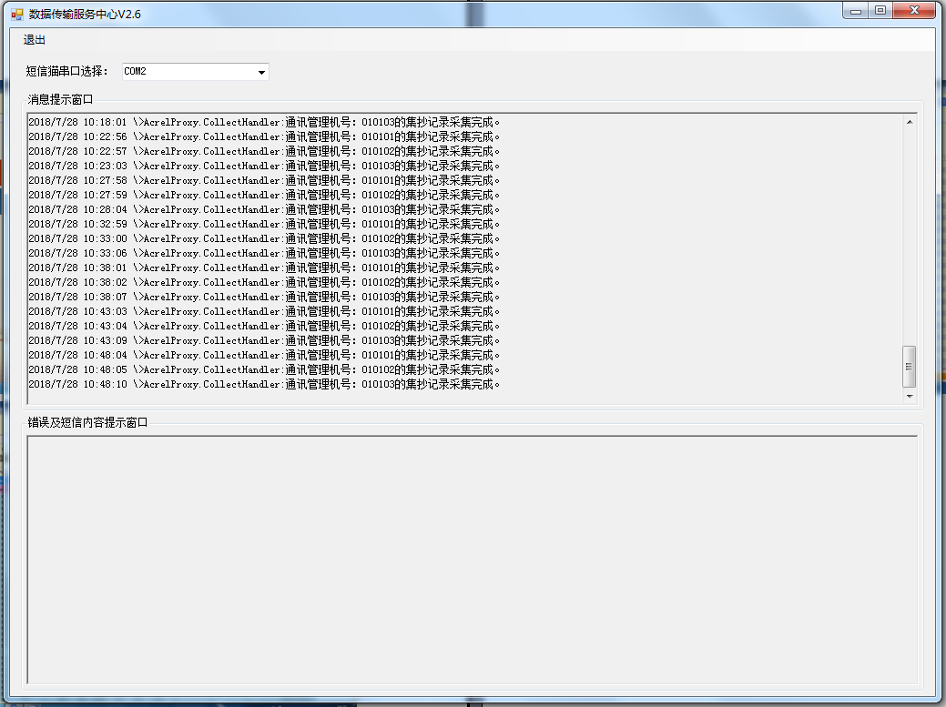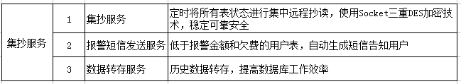 集中抄表服務(wù)程序包含三大模塊,除了常年運(yùn)行的定時(shí)對所有儀表進(jìn)行集中遠(yuǎn)程抄表以外,還集成了報(bào)警短信發(fā)送服務(wù),能將電費(fèi)金額預(yù)警和欠費(fèi)預(yù)警自動生成手機(jī)短信自發(fā)送給對應(yīng)的商鋪用戶,該功能需要與硬件短信貓配合使用。