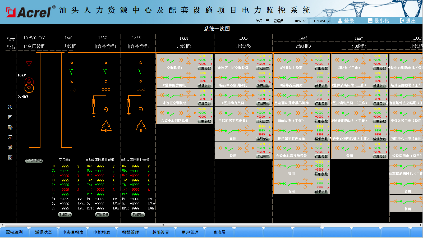在當(dāng)今配電設(shè)施的應(yīng)用中,項(xiàng)目的配電安全性至關(guān)重要,本文介紹的Acrel-2000電力監(jiān)控系統(tǒng)在汕頭人力資源市場的應(yīng)用,可以實(shí)現(xiàn)對配電室供配電回路用電的實(shí)時(shí)監(jiān)控,不僅能顯示回路用電狀況,還具有網(wǎng)絡(luò)通訊功能,可以與串口服務(wù)器、計(jì)算機(jī)等組成電力監(jiān)控系統(tǒng)。系統(tǒng)實(shí)現(xiàn)對采集數(shù)據(jù)的分析、處理,實(shí)時(shí)顯示配電室內(nèi)各配電回路的運(yùn)行狀態(tài),對負(fù)載越限具有彈出報(bào)警對話框、語音提示,并生成各種電能報(bào)表、分析曲線、圖形等,便于電能的遠(yuǎn)程抄表以及分析、研究,該系統(tǒng)運(yùn)行安全、可靠、穩(wěn)定,為商業(yè)廣場項(xiàng)目解決用電問題提供了真實(shí)可靠的依據(jù),取得了較好的企業(yè)效益。