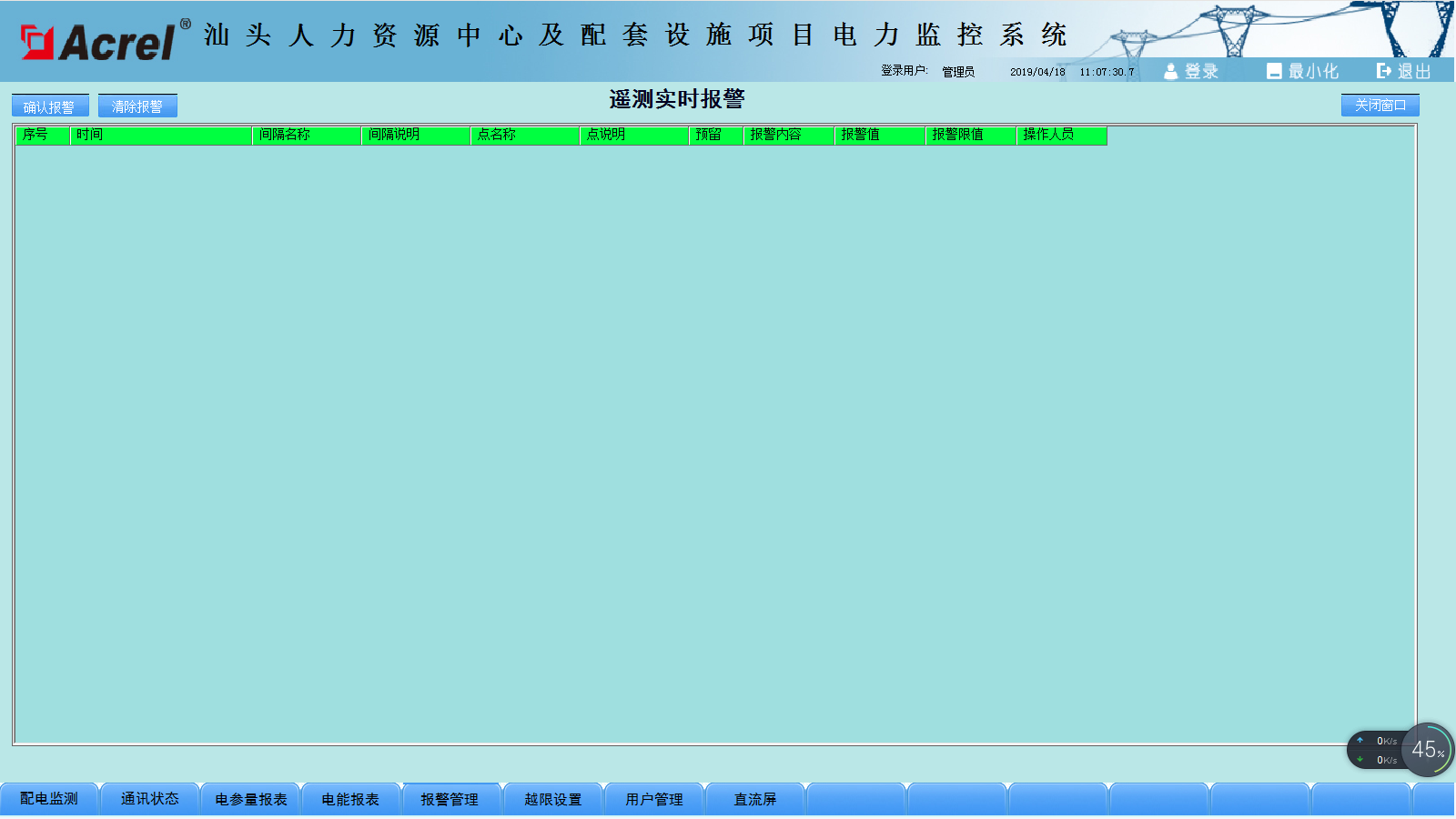 遙信和遙測報(bào)警功能,主要完成對低壓各出線回路的開關(guān)運(yùn)行狀態(tài)和負(fù)載進(jìn)線監(jiān)控,對開關(guān)變位和負(fù)載越限彈出報(bào)警界面指示具體的報(bào)警位置并聲音報(bào)警,提醒值班人員及時(shí)處理。負(fù)載越限值在相應(yīng)權(quán)限下可自由設(shè)置。