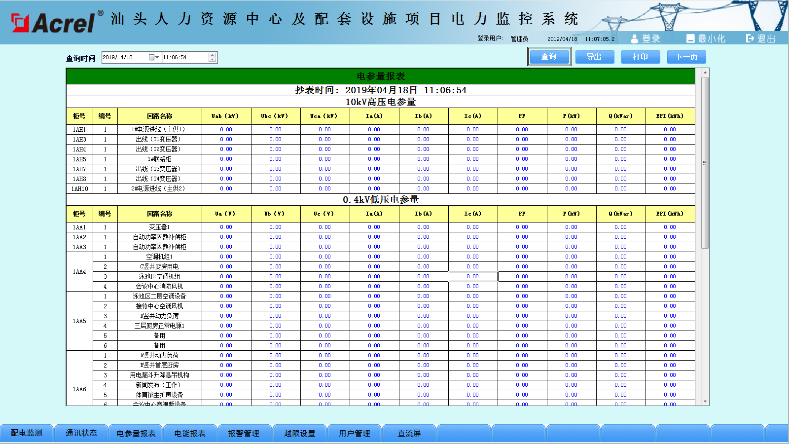 參數(shù)抄表功能,主要對低壓各出線回路的電參數(shù)進(jìn)線查詢。支持任意時(shí)刻電參數(shù)查詢,具備數(shù)據(jù)導(dǎo)出和報(bào)表打印等功能。該報(bào)表查詢汕頭人力資源市場配電室進(jìn)出線各低壓回路的電參數(shù),主要包括:三相電流、有功功率和有功電度。該報(bào)表各回路名稱和數(shù)據(jù)庫關(guān)聯(lián),方便用戶修改回路名稱。如下圖所示: